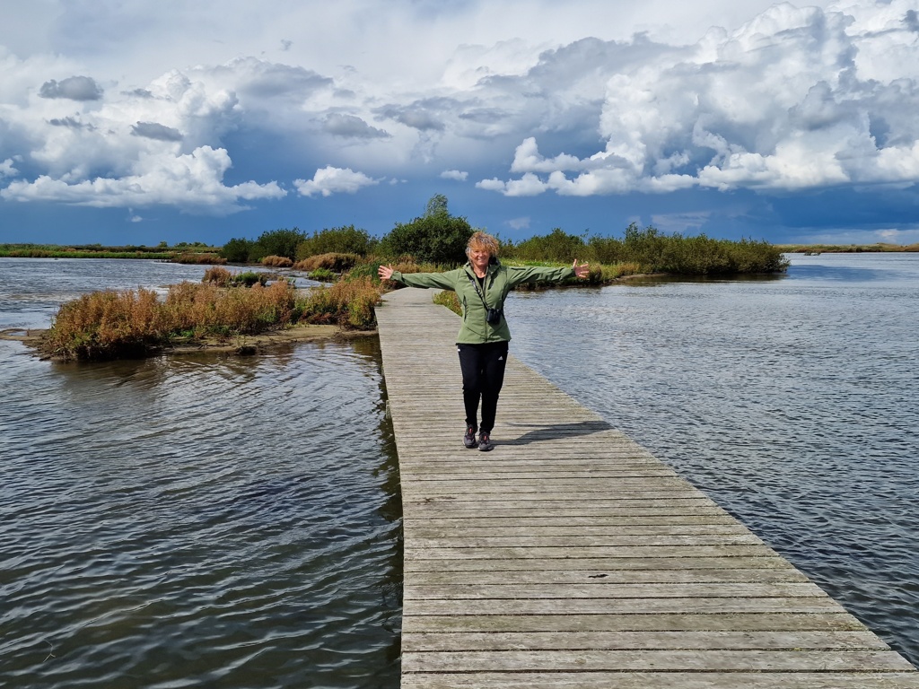 Op dag twee hadden we echt een route in ons hoofd. We zouden via de buitenzijden een rondje rond het eiland doen (de kustroute). Onze eerste stop was bij vogelkijkhut De Lepelaar. We stonden er nog maar net toen het begon te regenen. Eerst zachtjes en toen brak de hemel open. Met bakken viel het water uit de lucht. Binnen no time stroomde de vogelkijkhut vol met verzopen wandelaars. Het werd een schuilhut voor slecht weer. Maar zo snel als de regen ineens was gekomen, zo snel verdween die ook weer en konden we allemaal onze weg vervolgen.