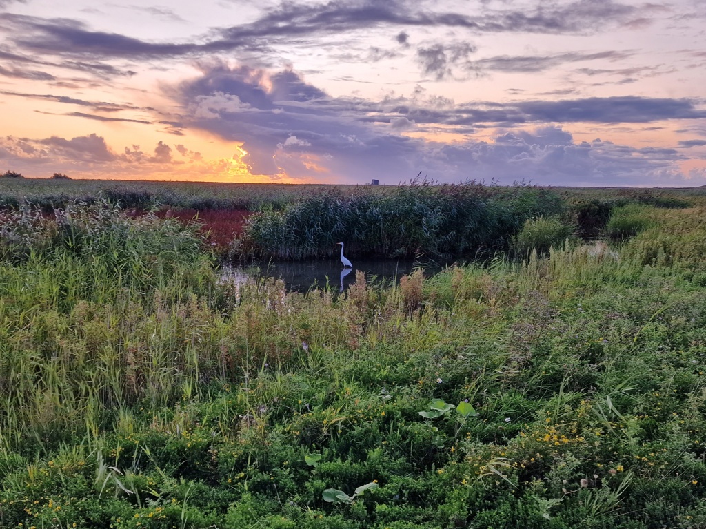 Tegen zonsondergang gaan we weer op pad. De kleuren zijn prachtig. Een gouden gloed ligt over het eiland. Het is bijzonder om een avondwandeling te maken. We komen alleen wat vrijwilligers tegen. De rest van de bezoekers zijn al lang naar huis. Aangekomen bij het vlonderpad, waar we deze middag moesten omkeren, kijken we elkaar verbaasd aan: Het is niet waar! De zwaan met zijn jongen ligt er nog steeds. Ze zijn geen meter verschoven. Er zit niets anders op. We moeten weer terug.