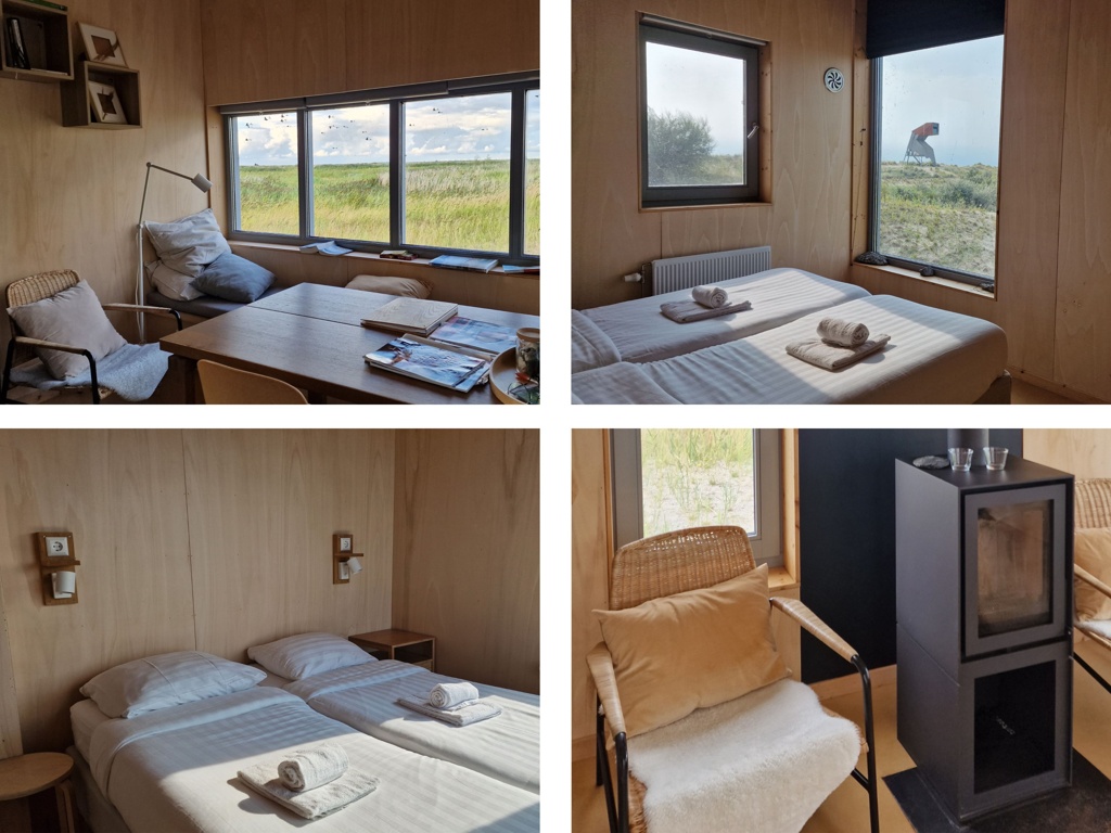 Ik werp een blik in de wc/doucheruimte. Ziet er prima uit. Dan naar boven. Twee ruime slaapkamers met dubbele bedden en enorme ramen met geweldig uitzicht. Ik kan moeilijk kiezen welke slaapkamer we nemen. In beide slaapkamers zijn de bedden opgemaakt. Ik kies uiteindelijk voor de kamer met uitzicht op De Steltloper. Dat moet prachtig zijn met de ondergaande zon.