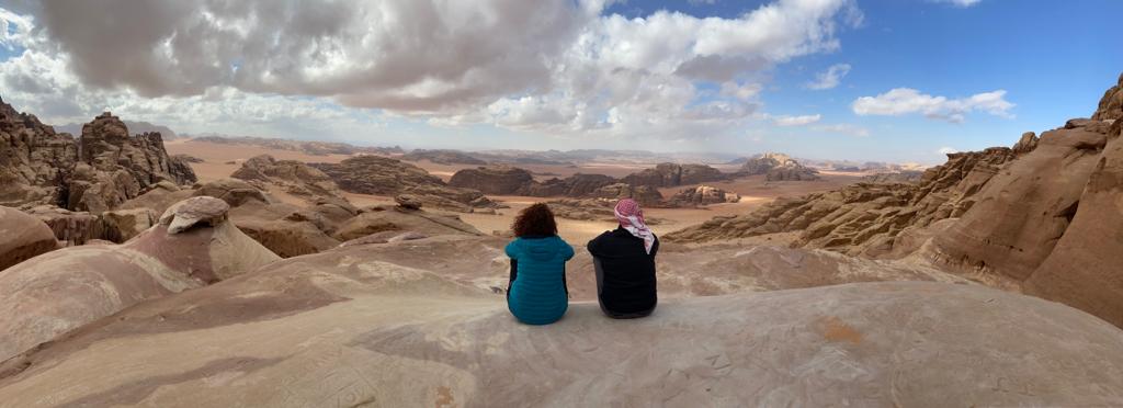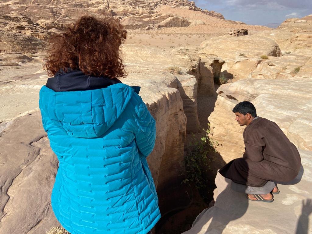 Omdat het weer onvoorspelbaar is en het in ieder geval ’s avonds flink afkoelt heb ik mijn blauwe Flex Down Jacket altijd bij me. Of aan, of in mijn rugzak, of om mijn middel geknoopt. Ik ontdek van alles aan de jas. In de Wadi Rum, waar het ’s avonds echt bij het nulpunt is en achterin de laadbak van de jeep berekoud en waaierig is, ontdek ik dat de elastieken manchetten iets wijd zijn, waardoor er koude lucht in de jas naar binnen wordt geblazen. Als ik de manchetten dicht houd, blijft het zelfs warm in mijn jas, zelfs als ik er slechts een enkel T-shirt onder heb.