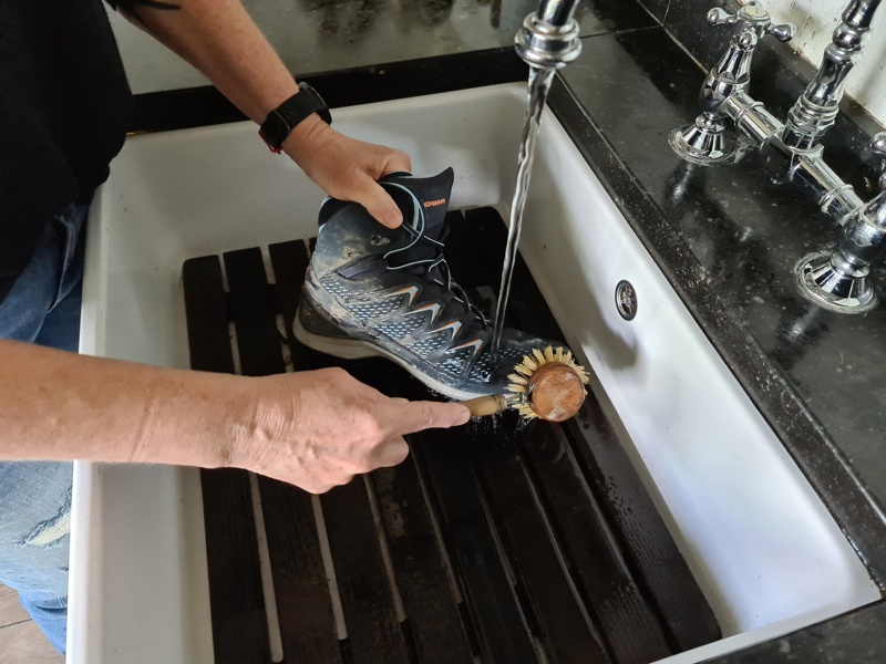 Thuisgekomen na het Krijtlandpad zijn mijn schoenen modderig en vochtig. Het onderhoud is simpel. Ik spoel ze af met lauw water onder de kraan en zet ze te drogen op een warm en droog plekje, maar niet bij een warmtebron als een radiator of kachel.