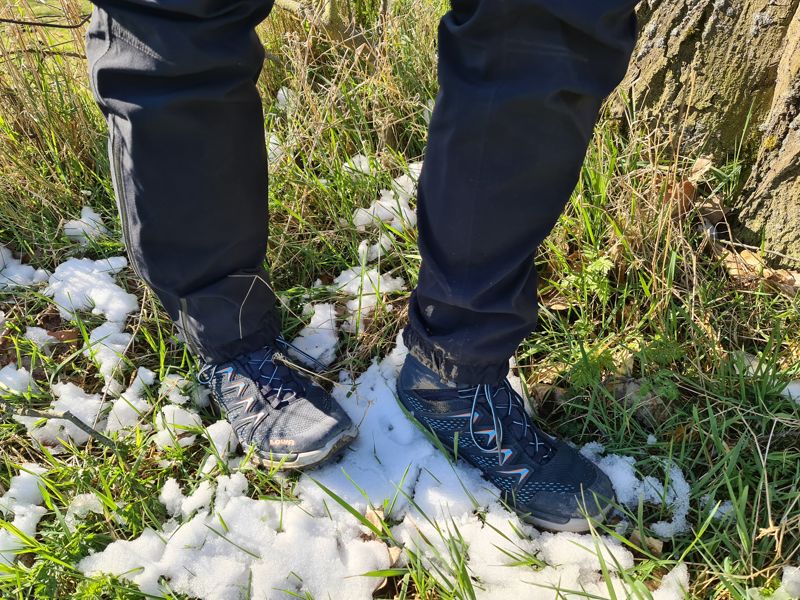 Ik had de steel blue/salmon gekregen. Prima. De grote verrassing kwam toen ik de schoenen uit de doos tilde; wat zijn ze licht! Dat is nog eens wat anders dan de leren kolossen met rode veters. Snel op de weegschaal. De schoenen wegen samen maar 790 gram. Ter vergelijk: mijn aller lichtste leren wandelschoenen wegen 1250 gram. Ik ben onder de indruk.