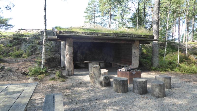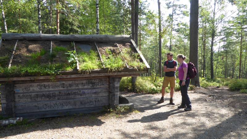We zijn hemelsbreed niet ver van de parkeerplaats en van onze auto. We kunnen er gewoon via een breed bospad naar toe. Als we opstaan zien we iets verderop een schuilhut staan. Daar kan iedereen gebruik van maken. Samen met de kampvuurplek waar we zaten, is het een ideale plek om wild te kamperen. Dat kan hier dus allemaal. Dit soort voorzieningen vind je overal in Zweden. Wat een geweldig land!