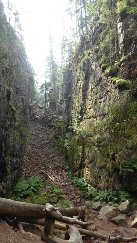 Steile bergwanden van wel 35 meter omsluiten de wandelroute.