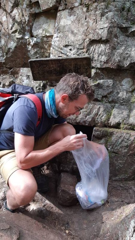 Anders wijst me op een gat in de wand van de kloof. Daar ligt een gastenboek. Het is een plek waar je zo aan voorbij gaat, ondanks het bord wat er bij staat. Ik haal de steen uit de muur en zie een plastic zakje met stukjes papier. Ik laat er mijn ansichtkaart achter.