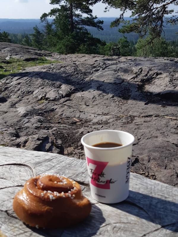 Bovenop gekomen hebben we een magnifiek uitzicht. We zien de kloof niet liggen, maar kijken naar de omgeving en een groot meer. Er is plek om te zitten. Hier kan en mag je ook een groot vuur maken. Anders haalt koffie en voor ieder een kaneelbule uit zijn rugzak. Dit noemen ze fika, een koekje bij de koffie. Dit is echt genieten. Na een hele bijzondere wandeling, een lekkere klim, op een plek met een geweldig uitzicht, zitten we heerlijk iets te eten en te drinken en kunnen we terugkijken op een bijzondere wandeling.