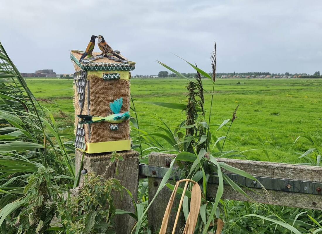 Aan het einde van Oostknollendam maakt de route een rare omweg. Sla hem niet over, want hij is prachtig! Het Wormer- en Jisperveld is een waterrijk natuurgebied waar het wemelt van de vogels. Zo ver als je kijken kunt veenweidegebied. Wat ook leuk is, is dat een kunstenares die hier woont, bezig is om een kunstroute uit te zetten. Overal staan vogelhuisjes en er worden witte palen neergezet waar gedichten op moeten verschijnen.