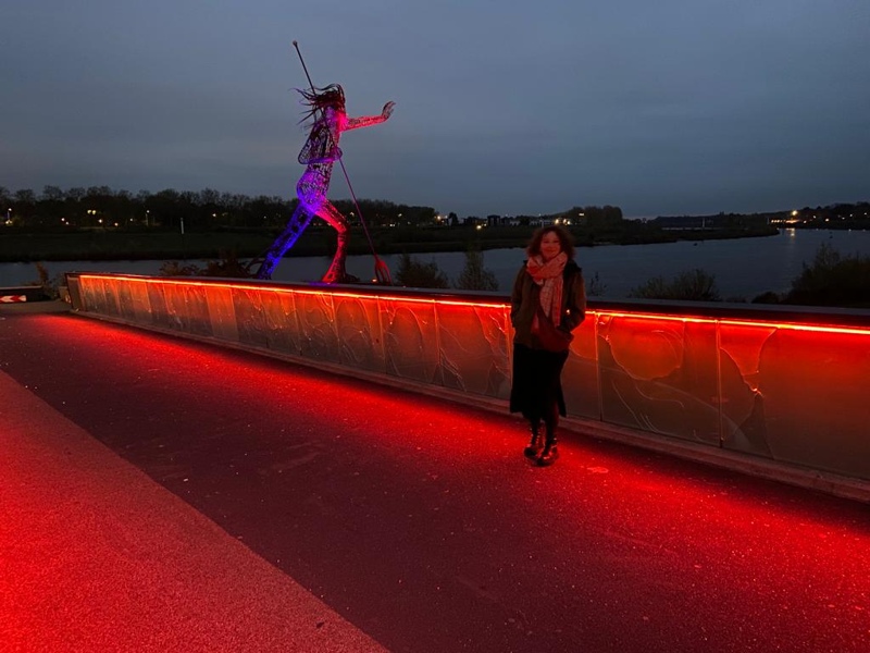 Nu wandelen we door de kronkelige straatjes, snuiven de sfeer op, zien een heleboel leuke eetgelegenheden en gaan speciaal even richting de Maas. De kleurig verlichte brug valt op. We lopen naar het kunstwerk en maken natuurlijk een foto.