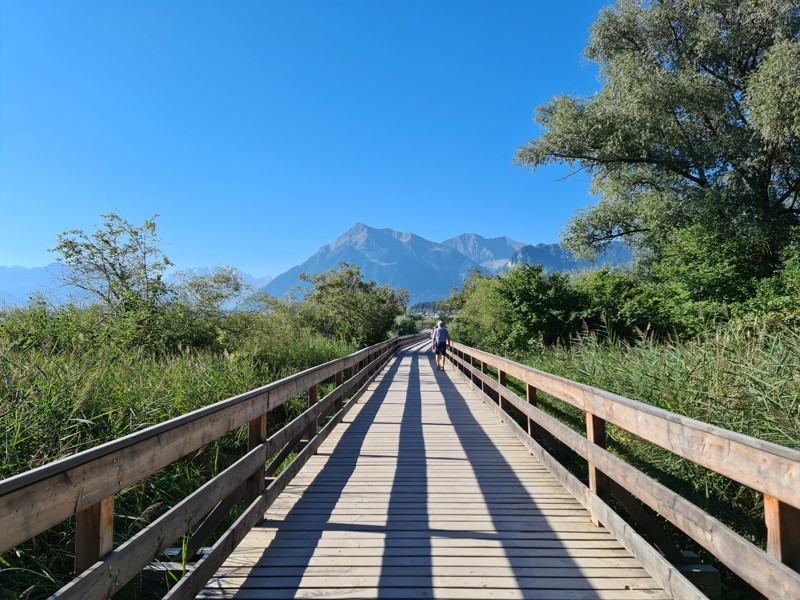 Vanuit het hotel stapte ik de ViaBerna op. Zo heb ik het graag. Door een soort van parkachtige omgeving, afgewisseld met natuurgebiedjes wandelde ik de eerste tijd langs het water van het Meer van Thun. Er is veel te zien en te beleven. Het is zaterdagochtend en dat merk je meteen aan het aantal wandelende mensen. Het was lekker druk.