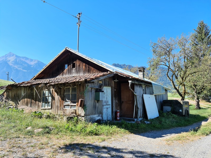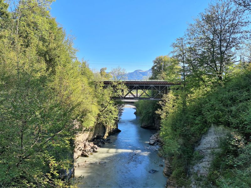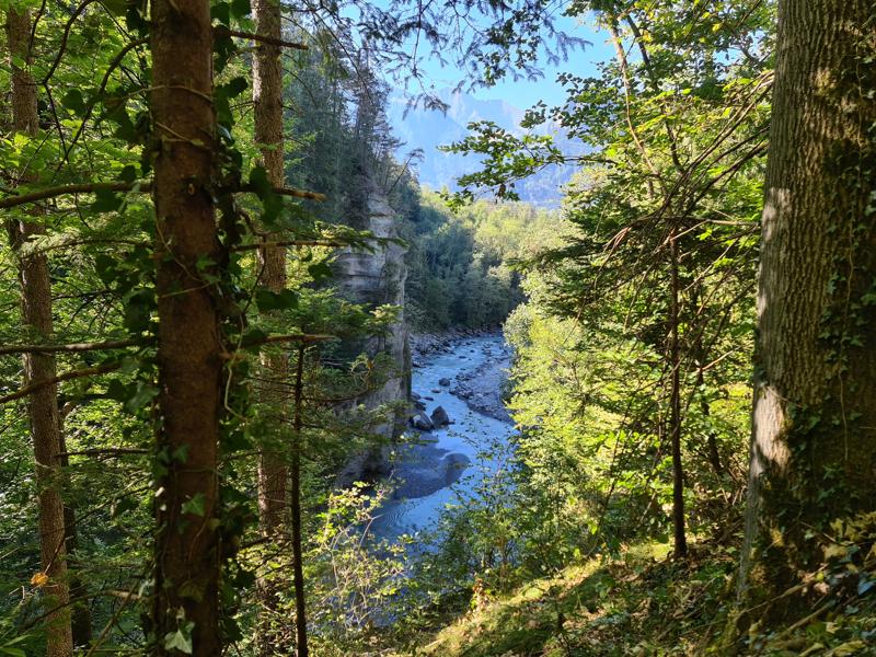Bij Gwatt gaat mijn pad omhoog. Ik kom nu hoog boven het Meer van Thun te lopen. Het uitzicht is geweldig. Boerenplaatsen, agrarisch gebied en bos wisselen elkaar af. En passant neem ik ook nog even een prachtige kloof mee.