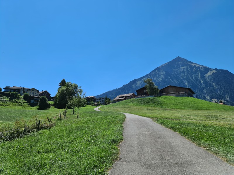 Bij Faulensee, waar je overigens ook een prachtig terras aan het water hebt, is het wel over met de pret. Vanaf hier gaat het omhoog, over het asfalt tussen de huizen door. Ook als ik het plaatsje uit ben gaat het nog steeds gestaag omhoog via asfaltwegen. Het laatste stukje gaat door het bos, dus dat valt dan weer mee.