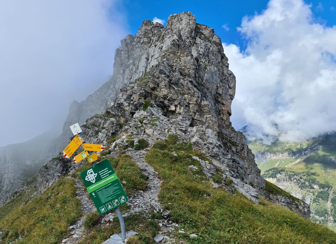 Het pad langs de bergwand duurt lang. Het is weinig afwisselend en er zitten een paar stevige klimmetjes in. Vooral de laatste klim die me naar de top van Sätteli brengt is een heftige. De top is een bijzonder plekje omdat ik links en rechts van de bergwand kan kijken. Ik kom van de linkerkant en zie rechts alleen maar witte mist. Af en toe trekt die en beetje op en zie ik hoge bergen aan de overkant met daarop eeuwige sneeuw. De rotsen hier worden ook wel de Hasli-Dolomites genoemd, door hun bijzondere vorm. Ik begrijp precies wat ze bedoelen.