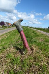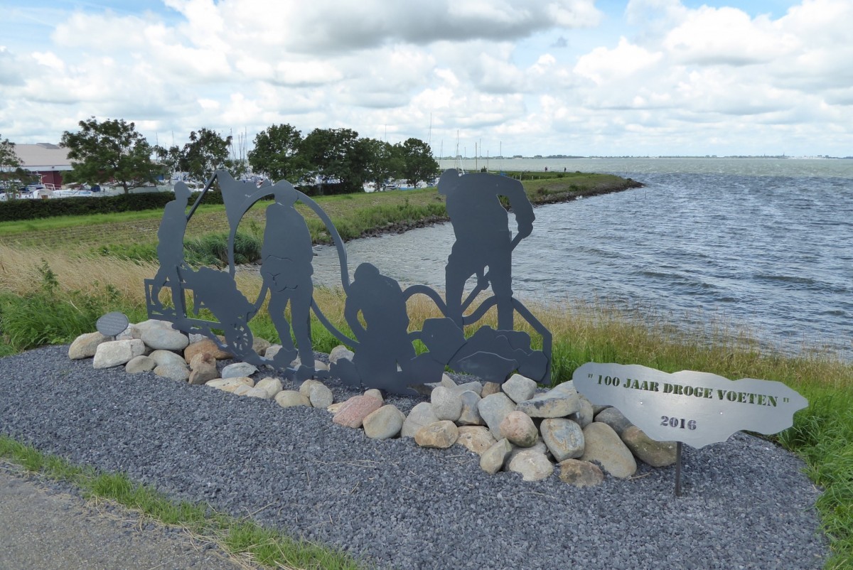 Langs de dijk wordt de bijna vergeten waternoodramp van 1916 herdacht. Precies 100 jaar geleden raast een noordwesterstorm over de Zuiderzee. Op meerdere plaatsen breken de dijken en komt onder andere het eiland Marken en een groot deel van Noord-Holland onder water. Ook dit deel van Noord-Holland heeft geleden onder de storm. Op borden langs de dijk is te zien hoe het water de loop van de dijk en het aanzicht heeft veranderd. Als kleine monumentjes staan er regenlaarzen langs de dijk. Ik fotografeer ze allemaal. Er is ook een echt monument opgericht vlak voor de haven in Andijk.
