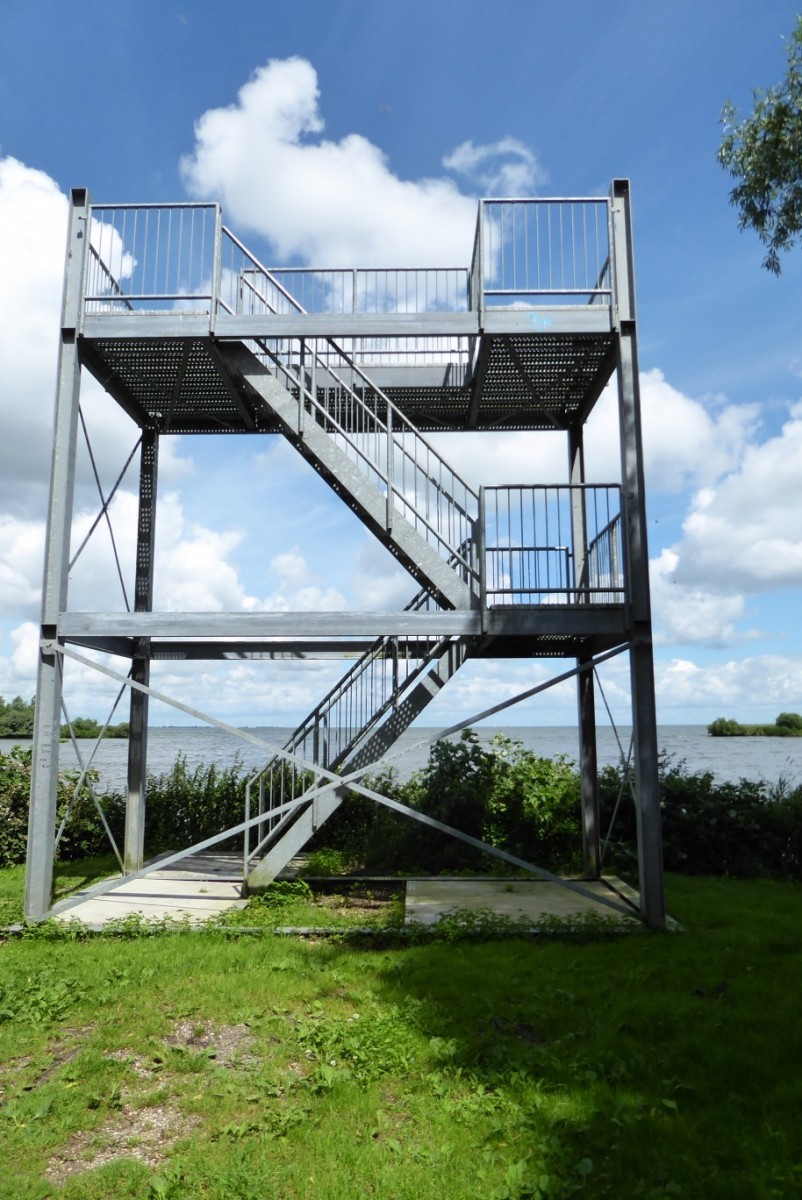 Na de Buurtjeshaven begint aan je rechterhand het Vooroever, een natuur- en recreatieproject buiten de dijk. Is er tijd voor een tweede stop? We kijken op onze horloges en zien dat de tijd voorbij is gevlogen en dat we niet echt opschieten. Het is zeer twijfelachtig of we de boot gaan halen. Dan moeten we het nu op een lopen zetten, niet meer pauzeren en geen foto’s en filmpjes meer maken. Dat kan niet de bedoeling zijn. Laat die boot maar zitten, we bedenken wel iets anders. We schuiven aan bij een picknicktafel en halen de lunch uit onze rugzak en eten op ons gemak een broodje. Het waait wel behoorlijk. Bij het parkeerterrein van Vooroever Koopmanspolder kiezen wij ervoor om het paadje naar de uitkijktoren in te lopen. Niet bewust hoor. We dachten dat het de korte route was langs het water. Blijkt het een doodlopend weggetje te zijn naar een uitkijktoren toe. We worden wel getrakteerd op een geweldig uitzicht. Toen weer terug en de goede route oppakken.