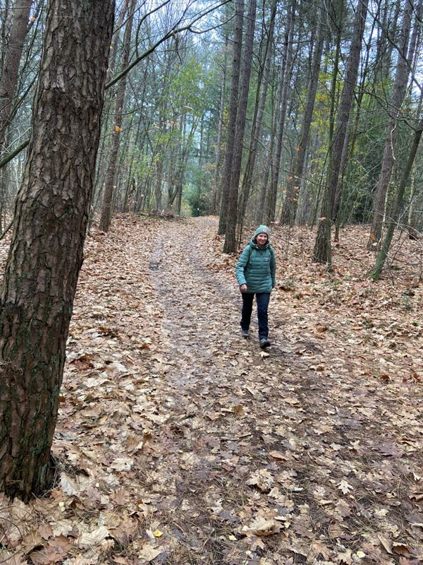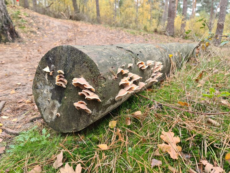 Nu wordt het een boswandeling. We halen diep adem en laten de koude lucht in onze longen stromen. Rondom ons is alles goudbruin en oranje. De herfst is op zijn allermooist. We speuren over de grond op zoek naar paddenstoelen om het herfstplaatje compleet te maken, maar die kunnen we niet vinden. Veel verder dan een boom met elfenbankjes komen we niet.