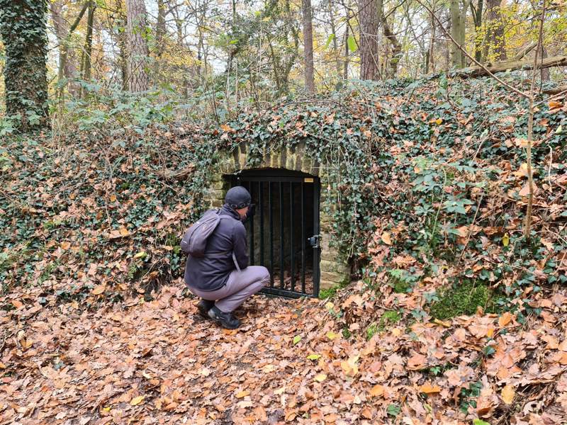 Dan gaan we op zoek naar de ijskelder. Echt zoeken hoeven we trouwens niet, hij ligt gewoon naast het pad. Een traliehek sluit de ijskelder af. Dat is nou weer jammer.
