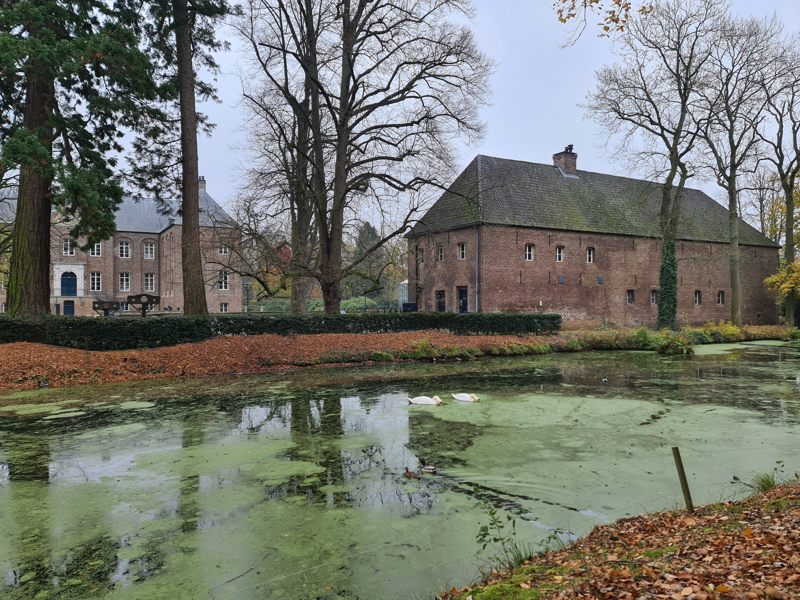 We zijn bijna aan het einde van onze wandeling. We lopen langs de slotgracht rond kasteel Arcen en rond de kasteeltuinen. Ik voel nog even aan de grote donkergroene deur of hij echt niet open is. Ik had graag naar binnen gewild om de kasteeltuinen te bezoeken. Helaas hebben ze een wintersluiting.