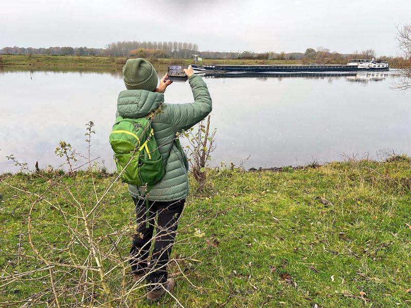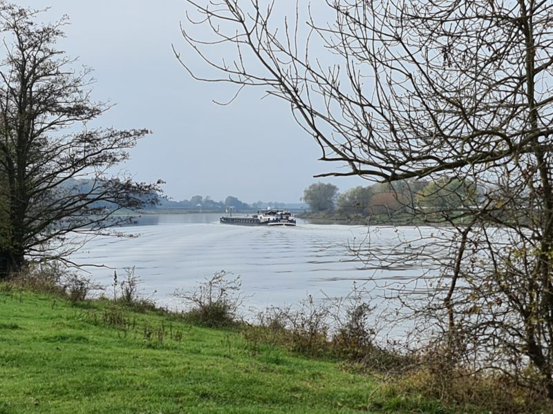 Maar eigenlijk heb je die app helemaal niet nodig. Het blijft natuurlijk gewoon een knooppuntenwandeling die gemakkelijk te volgen is. Vanaf de parkeerplaats gaan we door het klaphekje en lopen de dijk op. We hebben prachtig uitzicht over de Maas. Het is de tweede echte koude dag in november. Het heeft vannacht een beetje gevroren. Daar is nu niets meer van te zien. Voelen wel. Mijn telefoon verklapt dat het 3 graden boven nul is. Gelukkig is het droog.