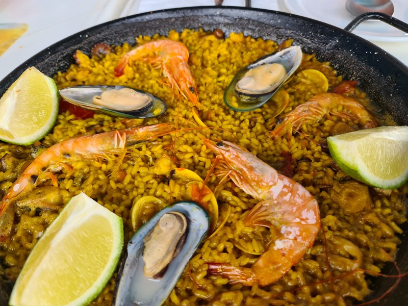 Het was een super leuke wandeling, vooral nu de beloning aan het eind komt. We schuiven aan op het terras bij restaurant Casa Pan. Dit is de plek om vis te eten. Omdat ik deze week nog geen paella heb gehad (je kunt toch niet zonder) bestellen we met z’n drieën een grote pan.