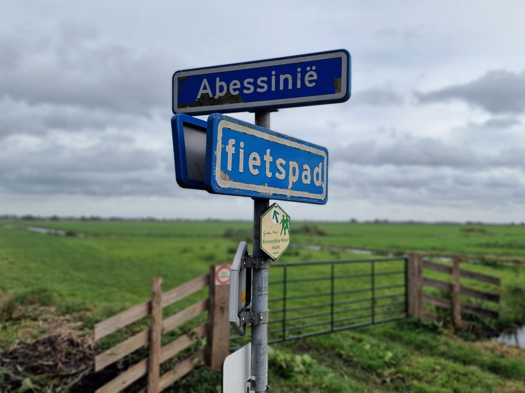We blijven het water volgen en slaan af op de Lecksdijk. We wijken daarmee af van de officiële wandelroute Retour Enkele Wiericke. We maken hem een paar kilometer korter, want de regen blijft dreigen en we willen weer terug zijn voordat het losbarst. We komen langs een bord met de naam Abessinië. Dit verwijst naar het buurschap dat hier ligt. Waar zou die naam vandaan komen? Abessinië was vroeger het keizerrijk Ethiopië. Hoe zouden die twee nou verbonden zijn?