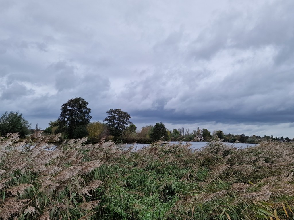 Donkere wolken komen onze kant op. We moeten snel doorlopen want de voorspelde regen komt er aan. Net op tijd zijn we binnen. Dit was een heerlijke en vooral verrassende wandeling. Ik had geen idee dat dit hier zou zijn.