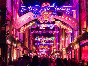 wandelen in de winter door Londen onder kleurrijke lichtjes.