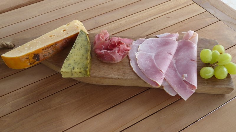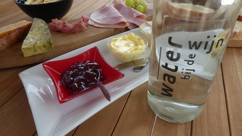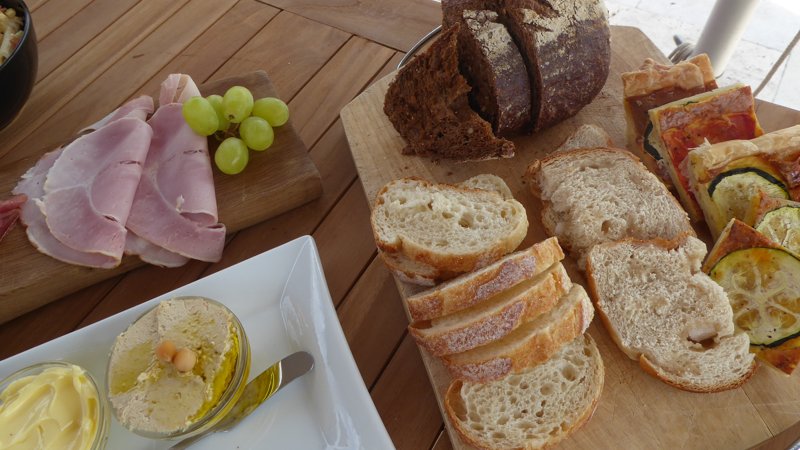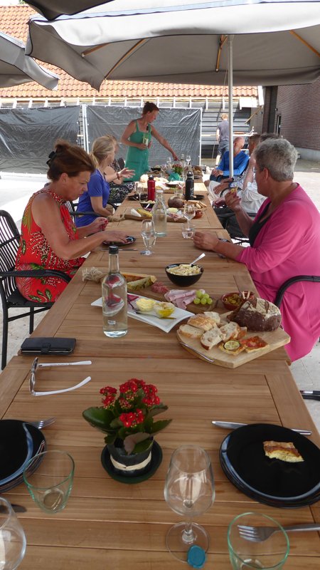 Na de rondleiding schuiven we aan op het terras. Dat is genieten. Heerlijke kazen, gerookte ham, kleine hapje en een lekkere salade. Natuurlijk allemaal streekproducten. Er wordt ook nog een rosé geproefd en daarna komt een rode wijn aan de beurt.