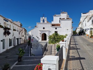 kerkje en fontein in witte bergdorp Mijas Puelbo